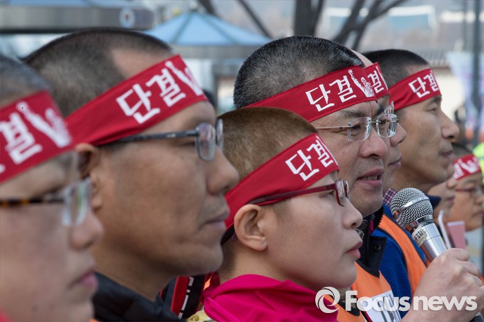 (서울=포커스뉴스) 14일 오후 서울 종로구 정부서울청사앞에서 전국교직원노동조합원 및 관계자들이 법외노조 판결에 대한 교육당국의 후속조치 철회를 촉구하고 있다.