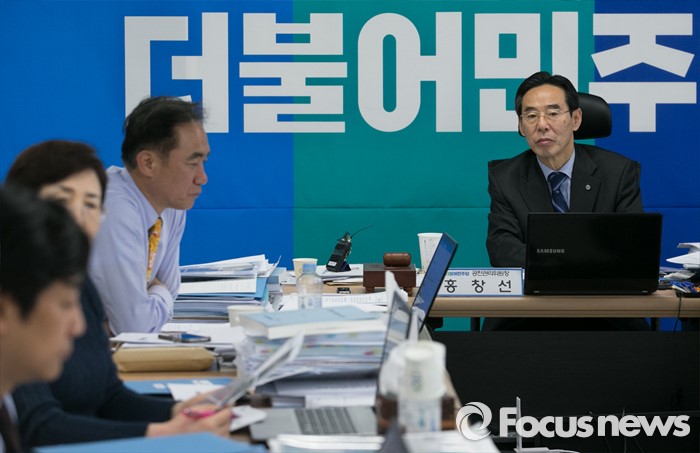 (서울=포커스뉴스) 20대 총선을 30일 앞둔 14일 오후 서울 여의도 더불어민주당사에서 열린 청년 비례대표 후보 면접에 참석한 홍창선 공천관리위원장 등 위원들이 후보들의 발언을 듣고 있다.