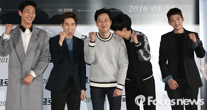 (서울=포커스뉴스) 14일 오후 서울 성동구 왕십리 CGV에서 열린 영화 '글로리데이' 언론시사회에 참석한 배우 지수(왼쪽부터), 김준면, 최정열(영화감독), 류준열, 김희찬이 포토타임을 갖고 있다.