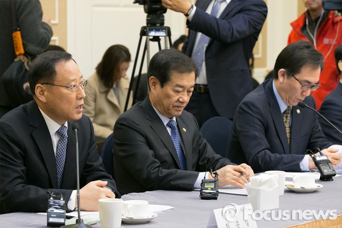 (서울=포커스뉴스) 최종일(왼쪽) 국정원 3차장이 15일 오전 서울 여의도 국회 귀빈식당에서 열린 안보상황 점검 긴급 당정협의에 참석해, 발언하는 동안, 조태열(오른쪽) 외교부 2차관과 황인무 국방부 차관이 경청하고 있다.