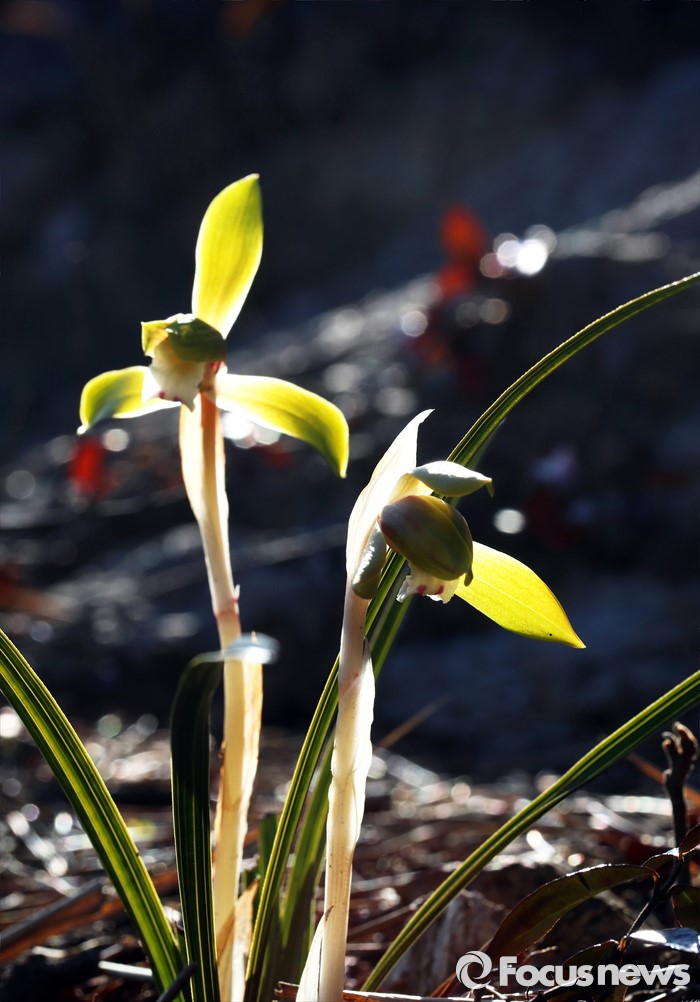 (완도=포커스뉴스) 꽃샘추위가 물러가고 봄기운이 다가온 15일 오전 전남 완도의 양지바른 야산에 자생하는 춘란이 꽃망울을 터트리고 있다. 꽃이 일찍 피기 때문에 보춘화라고도 하며,완도에서는 '꽁지발'이라고 부른다. <사진제공=이준택교수>
