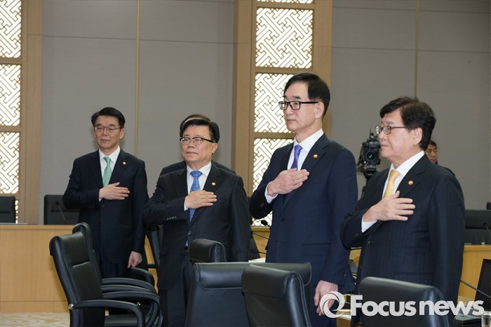 (세종=포커스뉴스) 15일 오전 세종시 정부세종청사 국무회의장에서 열린 청와대-세종청사 국무회의에서 국무위원들이 국기에 대한 경례를 하고 있다.