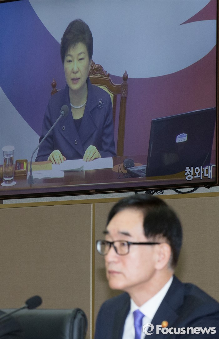 (세종=포커스뉴스) 15일 오전 세종시 정부세종청사 국무회의장에서 열린 청와대-세종청사 국무회의에서 국무위원들이 영상을 통해 박근혜 대통령의 모두발언을 경청하고 있다.