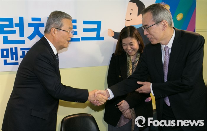 (서울=포커스뉴스) 김종인(왼쪽) 더불어민주당 비대위 대표가 15일 오후 서울 여의도 한 카페에서 열린 경제할배와 허심탄회 런치토크 - 샐러리맨편 행사에 참석해 주진형 총선정책공약단 부단장과 인사하고 있다.