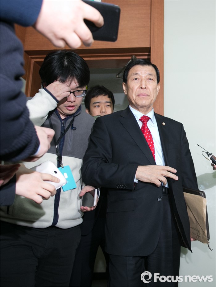 (서울=포커스뉴스) 황진하 새누리당 사무총장이 15일 오전 서울 여의도 당사에서 이한구 공천관리위원장과 비공개 논의를 위해 이동하며 취재진 질문을 받고 있다.