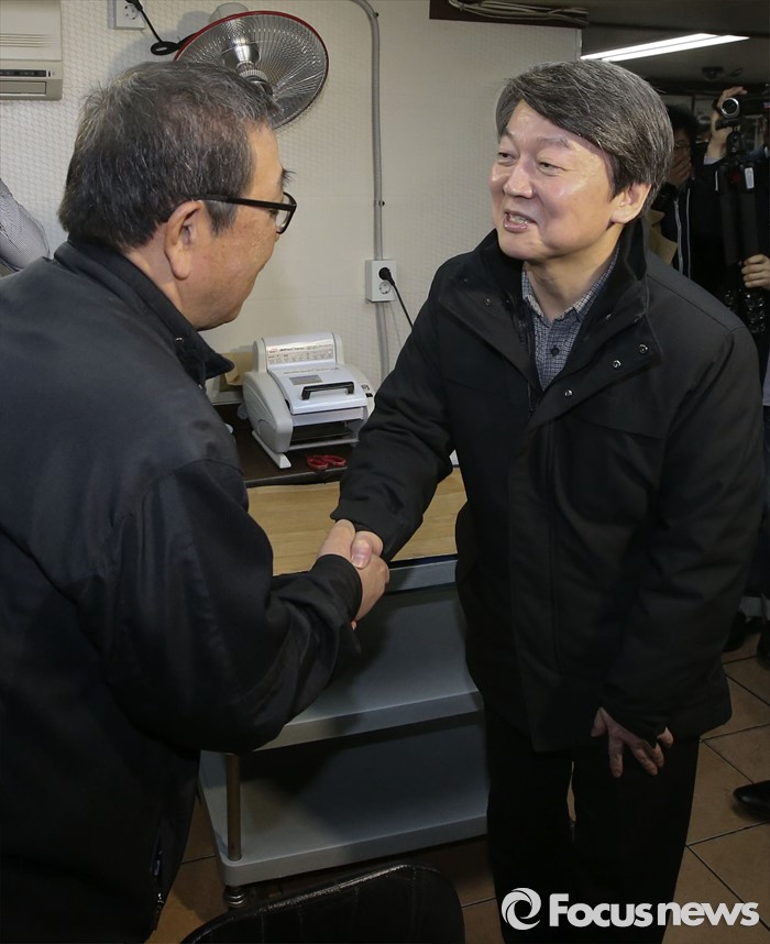 (서울=포커스뉴스) 안철수 국민의당 상임공동대표가 15일 오후 서울 마포구 연남동 한 식당에서 택시기사들과 악수를 나누고 있다.