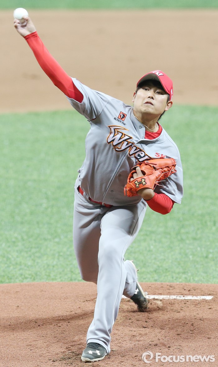 (서울=포커스뉴스) 15일 서울 고척스카이돔에서 열린 2016 프로야구 시범경기 SK-넥센 경기에서 SK 선발투수 문광은이 힘차게 투구하고 있다