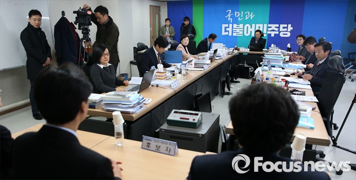 (서울=포커스뉴스) 홍창선 더불어민주당 공천관리위원장을 비롯한 위원들이 15일 오전 서울 여의도 당사에서 20대 총선 비례대표 후보 면접 심사를 하고 있다.