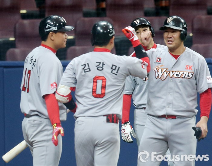 (서울=포커스뉴스) 15일 서울 고척스카이돔에서 열린 2016 프로야구 시범경기 SK-넥센 경기 4회초 2사 만루에서 SK 김강민이 우월 만루홈런을 치고 동료들의 환영을 받으며 홈인하고 있다.