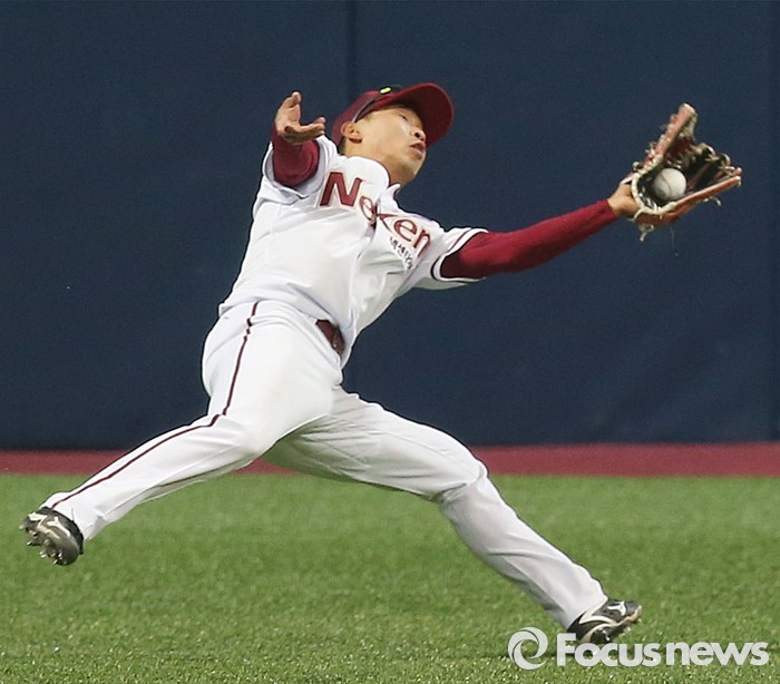 (서울=포커스뉴스) 15일 서울 고척스카이돔에서 열린 2016 프로야구 시범경기 SK-넥센 경기에서 5회 2사후 넥센 좌익수 고종욱이 SK 최정의 뜬공을 넘어지며 잡아내고 있다.