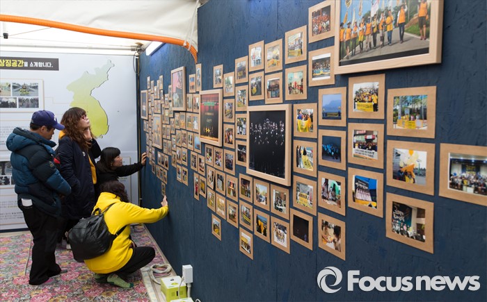 (서울=포커스뉴스) 15일 오후 서울 광화문광장에서 416가족협의회와 4.16연대가 세월호 700일 기획전시 개관식 및 2주기 추모의 달 공표 기자회견 후 기획전시관을 살펴보고 있다.