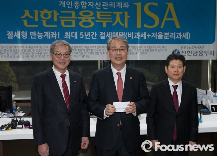 강대석 신한금융투자 사장은 "신한금융투자 ISA 포트폴리오의 장점은 절세와 안정성"이라며 "위험자산 비중과 시장위험을 줄이면서도 절세혜택을 최대한 누릴 수 있도록 운용 역량을 집중할 계획"이라고 강조했다.(서울=포커스뉴스) 15일 오후 서울 여의도 신한금융투자 본사 영업점에서 임종룡 금융위원장이 개인종합자산관리계좌(ISA) 가입 후 포토타임을 갖고 있다. 왼쪽부터 황영기 금융투자협회장, 임 위원장, 강대석 신한금융투자 사장. 2016.03.15 허란 기자 (서울=포커스뉴스) 15일 오후 서울 여의도 신한금융투자 본사 영업점에서 임종룡 금융위원장이 개인종합자산관리계좌(ISA) 가입을 위해 직원의 설명을 듣고 있다. 2016.03.15 허란 기자