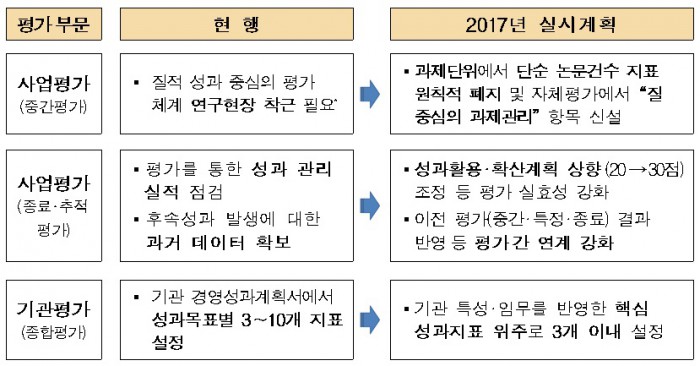 미래창조과학부는 내년도 국가연구개발 사업 및 기관평가 추진과 관련해 평가대상‧기준‧방법 등 세부사항을 제시한 ‘2017년 국가연구개발 성과평가 실시계획’을 15일 국가과학기술심의회 운영위원회 심의를 거쳐 확정했다.