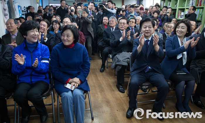 (서울=포커스뉴스) 노웅래 더불어민주당 의원이 15일 오후 서울 마포구 백범로에서 내·외빈들과 함께 선거사무소 개소식을 하고 있다. 오른쪽 두번째부터 노웅래 의원, 박영선 의원