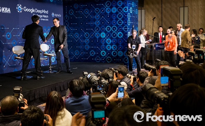(서울=포커스뉴스) 15일 오후 서울 광화문 포시즌스 호텔에서 열린 구글 딥마인드 챌린지 매치 제5국 기자회견을 마친 바둑기사 이세돌 9단과 데미스 하사비스 구글 딥마인드 최고경영자가 악수하고 있다.