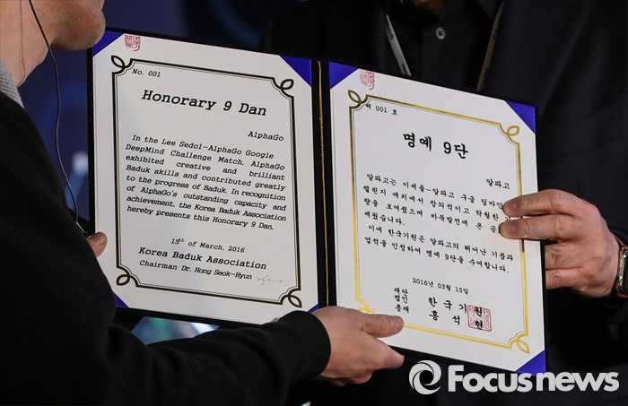 (서울=포커스뉴스) 15일 오후 서울 광화문 포시즌스 호텔에서 열린 구글 딥마인드 챌린지 매치 시상식에서 알파고 프로그램 개발을 총괄한데이비드 실버 박사(왼쪽)가 홍석현 대한바둑협회장으로부터 '알파고 명예 9단증'을 받고 있다.