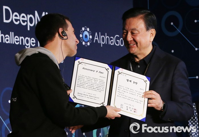 (서울=포커스뉴스) 15일 오후 서울 광화문 포시즌스 호텔에서 열린 구글 딥마인드 챌린지 매치 시상식에서 알파고 프로그램 개발을 총괄한데이비드 실버 박사(왼쪽)가 홍석현 대한바둑협회장으로부터 '알파고 명예 9단증'을 받고 있다.