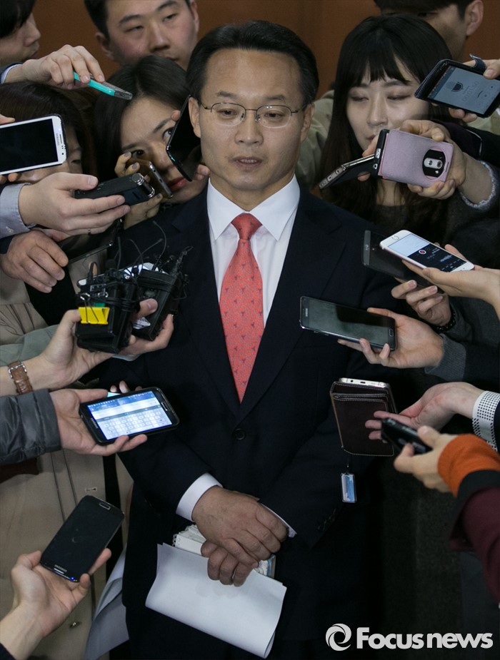 | △ 취재진 앞에 선 조해진 |