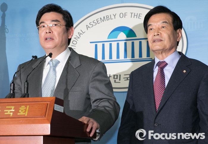 (서울=포커스뉴스) 20대 총선 공천 배제(컷오프)된 서상기(오른쪽), 홍지만 새누리당 의원이 16일 오전 서울 여의도 국회 정론관에서 불출마 선언 및 당 결정 수용 기자회견을 하고 있다.