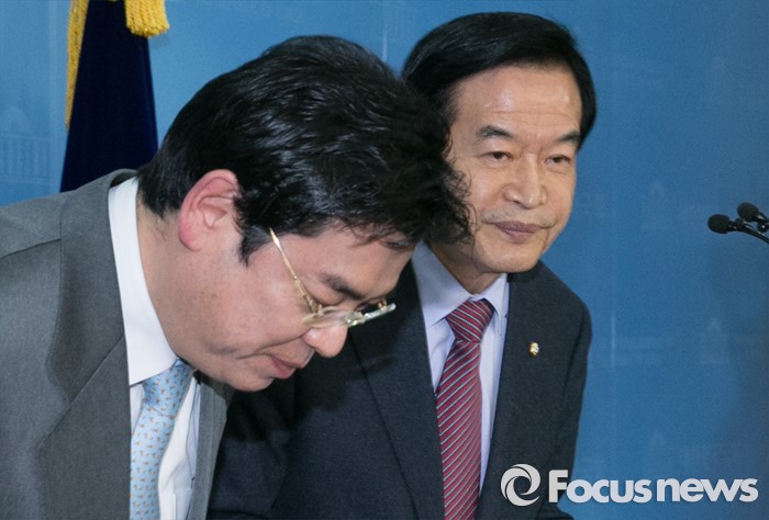 (서울=포커스뉴스) 20대 총선 공천 배제(컷오프)된 서상기(오른쪽), 홍지만 새누리당 의원이 16일 오전 서울 여의도 국회 정론관에서 불출마 선언 및 당 결정 수용 기자회견을 마친 뒤 인사하고 있다.