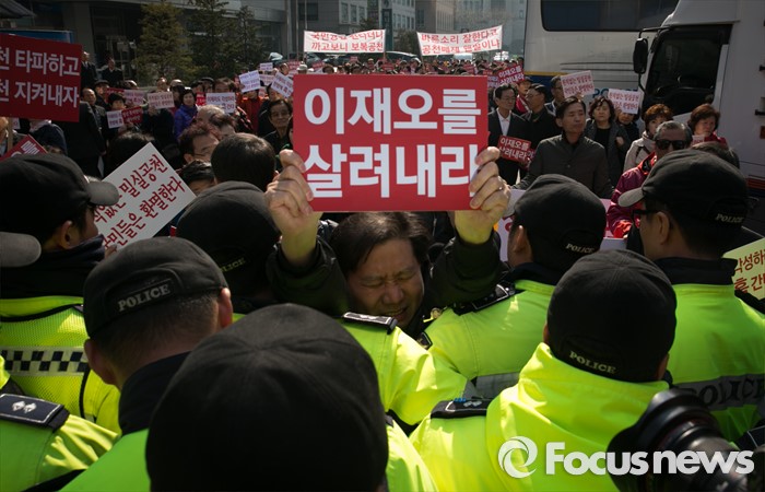 (서울=포커스뉴스) 16일 오전 서울 여의도 새누리당사 앞에서 공천 배제(컷오프)된 이재오 의원의 지지자들이 공천관리위원회의 결정 철회를 촉구하는 집회를 하고 있다.