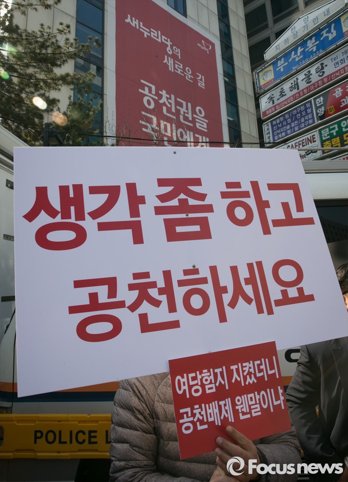 (서울=포커스뉴스) 16일 오전 서울 여의도 새누리당사 앞에서 공천 배제(컷오프)된 이재오 의원의 지지자들이 공천관리위원회의 결정 철회를 촉구하는 집회를 하고 있다.