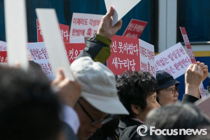 (서울=포커스뉴스) 16일 오전 서울 여의도 새누리당사 앞에서 공천 배제(컷오프)된 이재오 의원의 지지자들이 공천관리위원회의 결정 철회를 촉구하는 집회를 하고 있다.