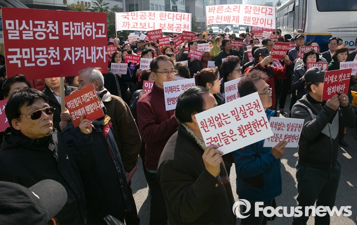 (서울=포커스뉴스) 16일 오전 서울 여의도 새누리당사 앞에서 공천 배제(컷오프)된 이재오 의원의 지지자들이 공천관리위원회의 결정 철회를 촉구하는 집회를 하고 있다.