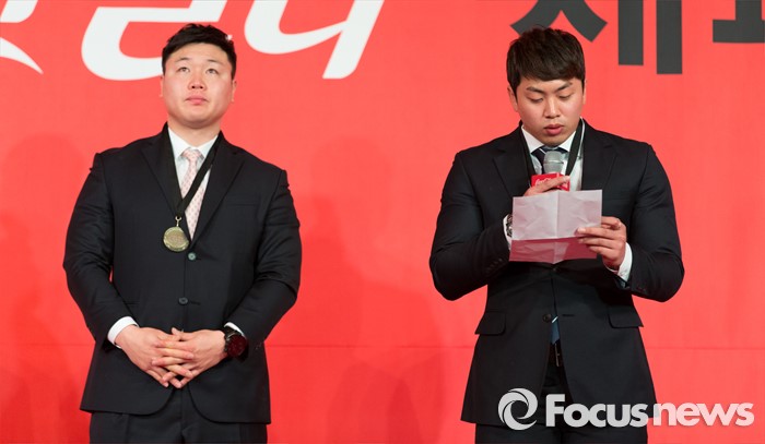 (서울=포커스뉴스) 16일 오전 서울 중구 더플라자호텔 그랜드볼룸에서 제21회 코카콜라 체육대상 시상식에 참석한 봅슬레이 서영우(오른쪽)와 원윤종이 우수지도자상을 수상한 고 맬컴 로이드 코치에게 준비해온 편지를 읽고 있다.
