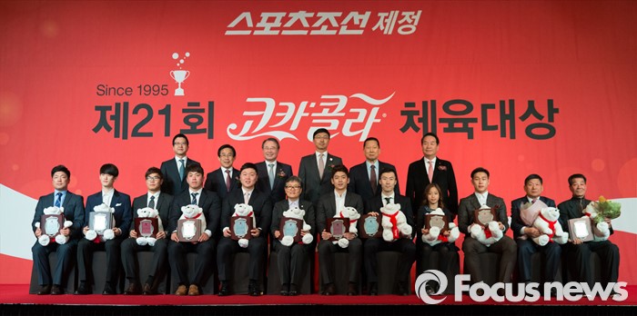 (서울=포커스뉴스) 16일 오전 서울 중구 더플라자호텔 그랜드볼룸에서 열린 제21회 코카콜라 체육대상 시상식에서 수상자들이 기념촬영을 하고 있다.