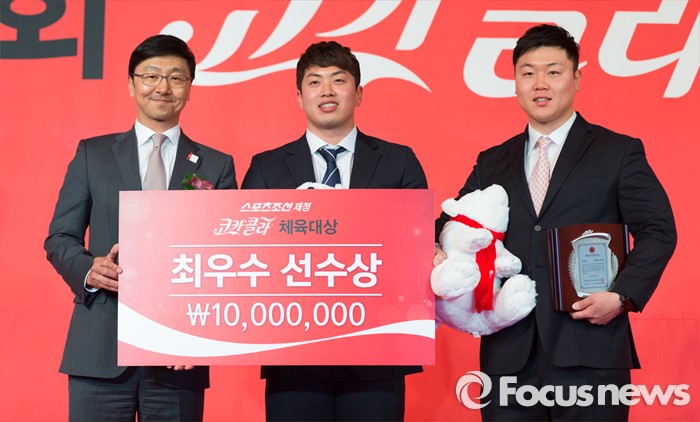 (서울=포커스뉴스) 16일 오전 서울 중구 더플라자호텔 그랜드볼룸에서 제21회 코카콜라 체육대상 시상식에 참석한 봅슬레이 대표 원윤종(가운데)과 서영우가 최우수선수상 수상 후 기념촬영을 하고 있다. 왼쪽은 이창엽 코카콜라 대표이사.