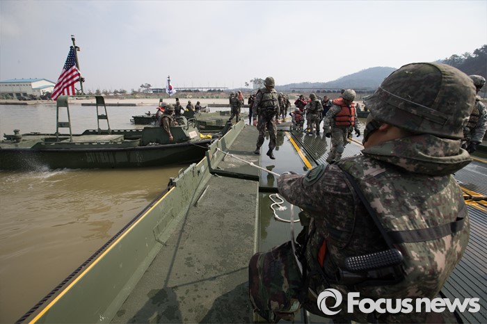 (이천=포커스뉴스) 16일 오전 경기도 이천시 7공병여단 도하훈련장에서 열린 '한·미 연합 소부대 도하훈련'에서 한국군 제7공병여단 도하대대와 미군 제2전투항공여단 공병대대 장병들이 부교를 설치하고 있다.