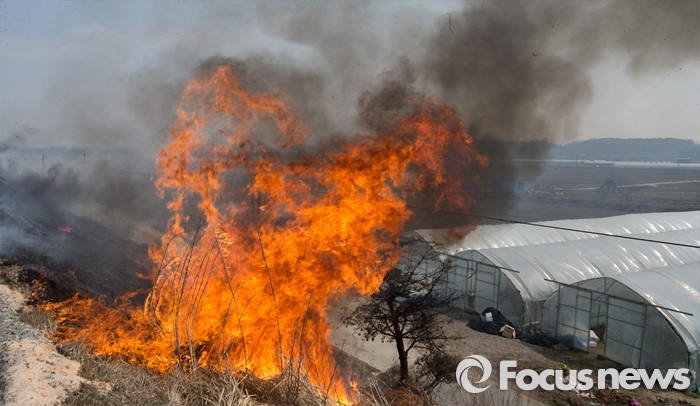 (청주=포커스뉴스) 16일 오후 충북 청주시 흥덕구 신대동 차로 바로 옆에서 눈두렁이 태우기를 하고 있어 지나는 차량에 위협이 되고 있다.