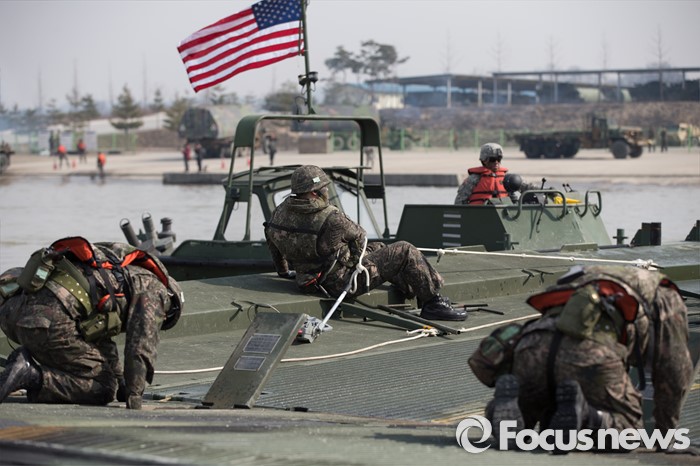 (이천=포커스뉴스) 16일 오전 경기도 이천시 7공병여단 도하훈련장에서 열린 '한·미 연합 소부대 도하훈련'에서 한국군 제7공병여단 도하대대와 미군 제2전투항공여단 공병대대 장병들이 부교를 설치하고 있다.