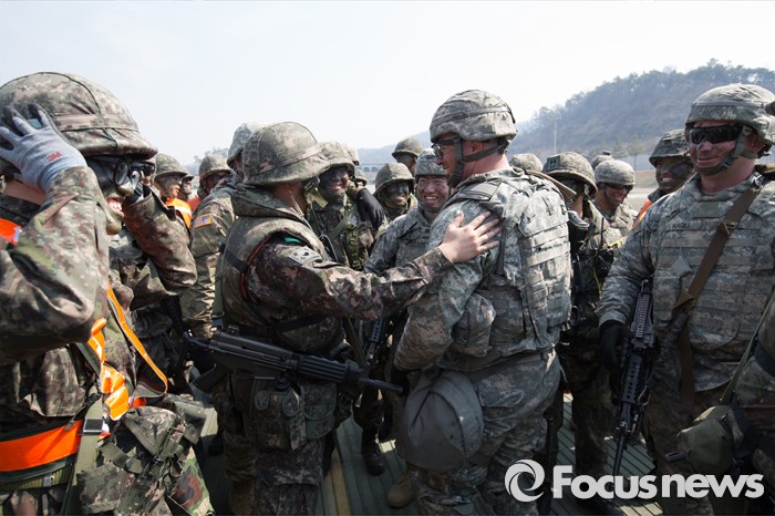 (이천=포커스뉴스) 16일 오전 경기도 이천시 7공병여단 도하훈련장에서 한국군 제7공병여단 도하대대와 미군 제2전투항공여단 공병대대의 '한·미 연합 소부대 도하훈련'을 마친 장병들이 서로를 격려하고 있다.