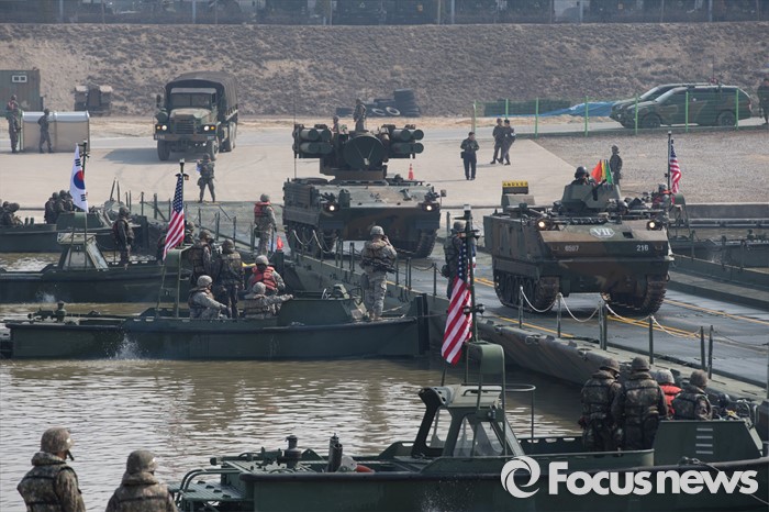 (이천=포커스뉴스) 16일 오전 경기도 이천시 7공병여단 도하훈련장에서 열린 한국군 제7공병여단 도하대대와 미군 제2전투항공여단 공병대대의 '한·미 연합 소부대 도하훈련'에서 전차와 장갑차들이 부교를 도하하고 있다.
