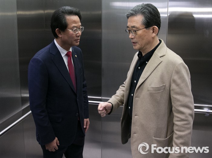(서울=포커스뉴스) 공천 배제(컷오프)된 류성걸(왼쪽) 새누리당 의원이 16일 오후 서울 여의도 당사에서 공천관리위원회의에 참석하기 위해 승강기에 오르는 이한구 위원장과 대화하고 있다.