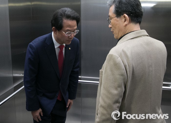 (서울=포커스뉴스) 공천 배제(컷오프)된 류성걸(왼쪽) 새누리당 의원이 16일 오후 서울 여의도 당사에서 공천관리위원회의에 참석하기 위해 승강기에 오르는 이한구 위원장을 향해 인사하고 있다.