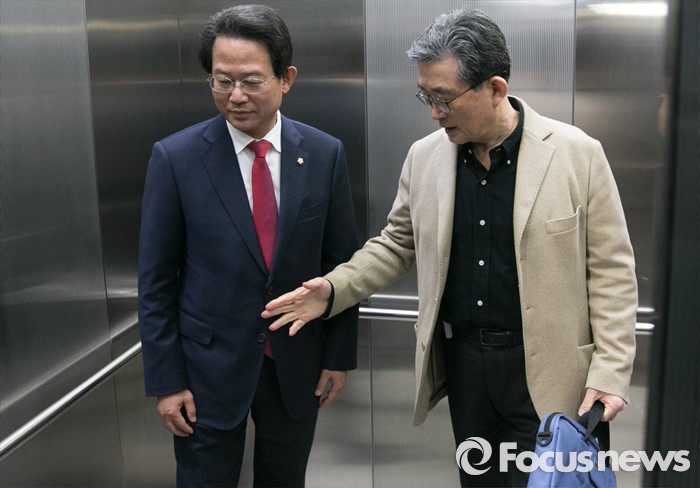 (서울=포커스뉴스) 공천 배제(컷오프)된 류성걸(왼쪽) 새누리당 의원이 16일 오후 서울 여의도 당사에서 공천관리위원회의에 참석하기 위해 승강기에 오르는 이한구 위원장과 대화하고 있다.