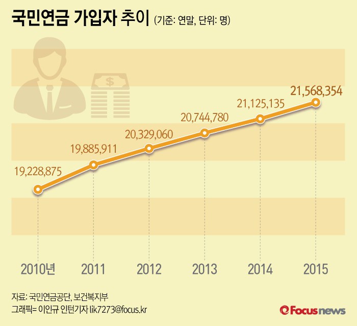 (서울=포커스뉴스) 16일 보건복지부에 따르면 2015년 말 현재 전체 가입자는 2,157만 명으로 전년대비 44만 명이 증가하였다.