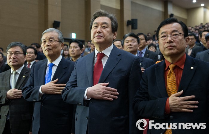 (서울=포커스뉴스) 김무성 새누리당 대표(오른쪽 두번째)와 김종인 더불어민주당 대표(왼쪽 두번째)가 16일 오후 서울 여의도 국회 의원회관에서 열린 '자영업자 정책연대 및 생존권 사수 출정식'에 참석해 국기에 대한 경례를 하고 있다.