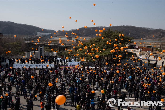 (파주=포커스뉴스) 16일 오후 경기도 파주시 임진각 망배단에서 개성공단 입주기업, 영업기업, 협력기업 등 대표를 비롯한 임직원과 가족들이 공단재가동 및 실질보상을 촉구하며 풍선을 날리고 있다.