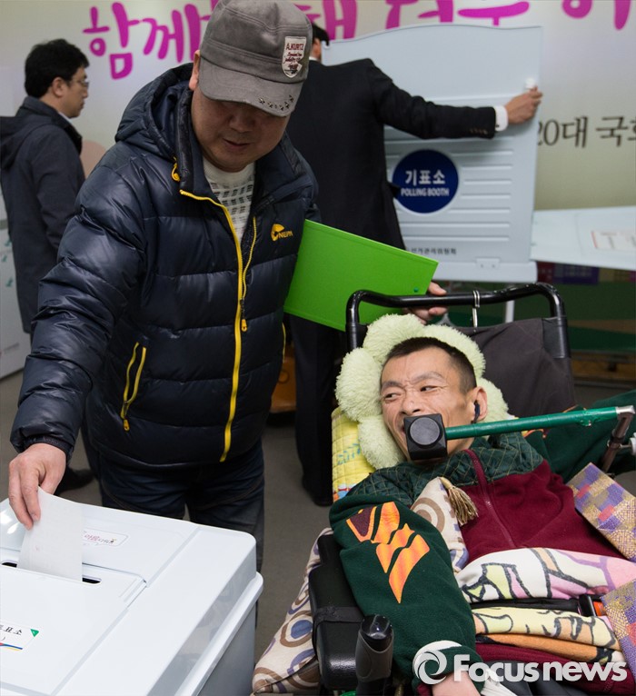 (서울=포커스뉴스) 16일 오후 서울 영등포구 이룸센터에서 열린 '20대 총선 거동불편유권자 대상 사전투표 모의 체험행사'에 참석한 장애인 유권자가 보호자의 도움을 받아 투표함에 투표지를 넣고 있다.