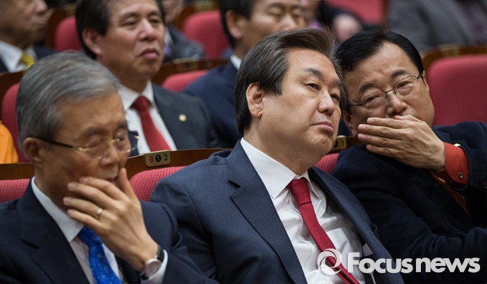 (서울=포커스뉴스) 김무성(가운데) 새누리당 대표와 이현재(오른쪽) 의원이 16일 오후 서울 여의도 국회 의원회관에서 열린 '자영업자 정책연대 및 생존권 사수 출정식'에 참석해 대화하고 있다. 왼쪽은 김종인 더불어민주당 비대위 대표.
