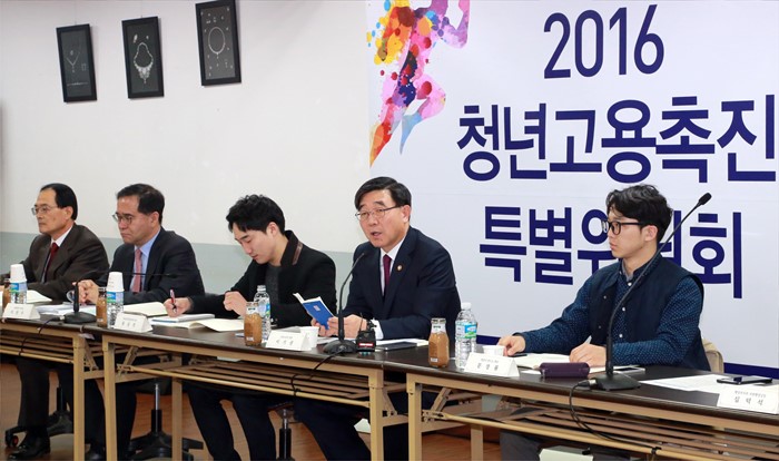 (서울=포커스뉴스) 이기권 고용노동부 장관이 15일 오후 서울 종로구 소재 MJC보석직업전문학교를 방문, 2016년 제1차 청년고용촉진특별위원회를 열고 청년패널들의 의견을 수렵하고 있다. <사진제공=고용노동부>