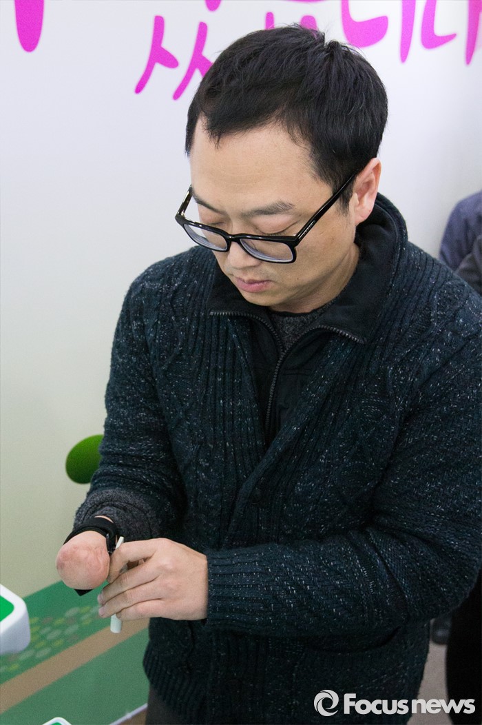 (서울=포커스뉴스) 16일 오후 서울 영등포구 이룸센터에서 열린 '20대 총선 거동불편유권자 대상 사전투표 모의 체험행사'에 참석한 장애인 유권자가 손목활용형 기표용구를 만지고 있다.
