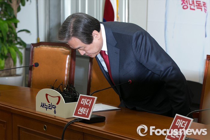(서울=포커스뉴스) 김무성 새누리당 대표가 16일 오후 서울 여의도 국회에서 긴급 기자회견을 하기 위해 자리에 앉고 있다. 김 대표는 이 자리에서 "오전에 열린 최고위원회의에서 단수 추천지역 7곳과 우선 추천지역 1곳을 공천관리위원회에 보류 요청했다"고 밝혔다.