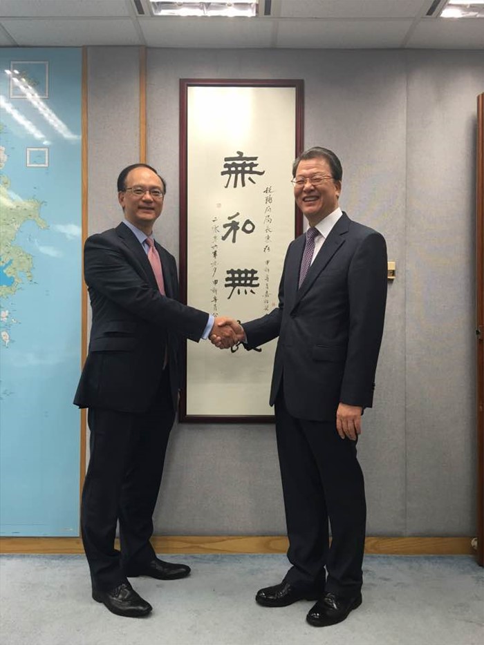 (서울=포커스뉴스) 16일 홍콩 국세청에서 열린 한국-홍콩 국세청장 회의에서 임환수(오른쪽) 국세청장이 웡 큔파이(Wong Kuen-fai) 홍콩 국세청장과 악수하고 있다.