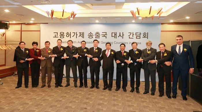 (서울=포커스뉴스) 이기권 고용노동부장관은 16일 오후 서울 중구 프레스센터에서 열린 고용허가제 송출국 대사 간담회에 참석해 기념촬영을 하고 있다. <사진제공=고용노동부>