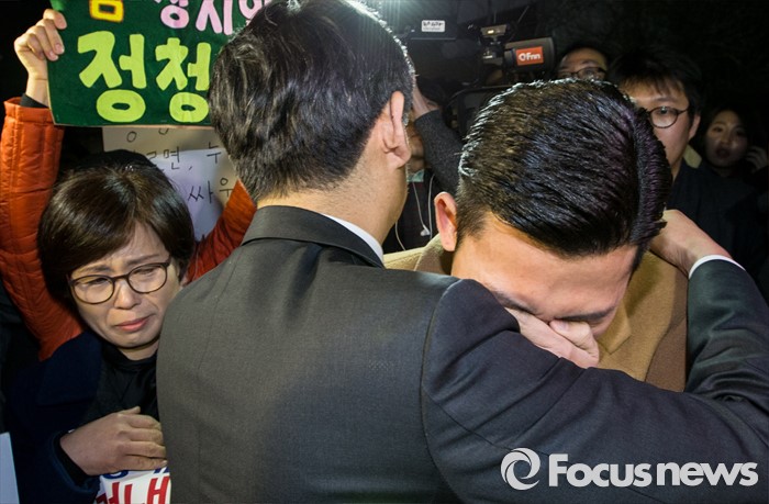 (서울=포커스뉴스) 20대 총선에서 공천배제된 정청래 더불어민주당 의원이 16일 오후 서울 여의도 당사 앞에서 기자회견을 가진 후 한 지지자를 위로하고 있다.